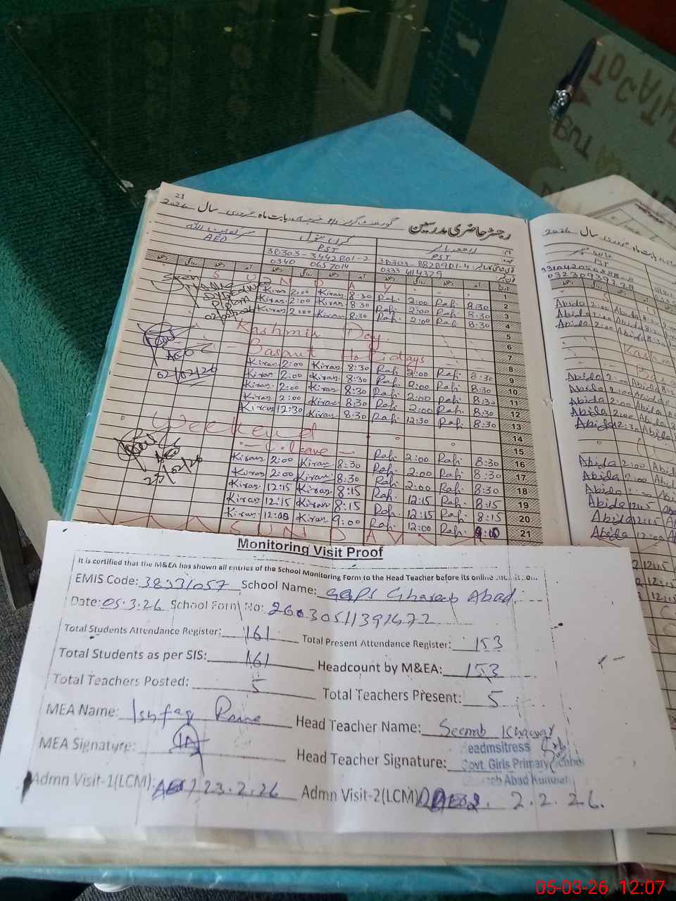 | Attendance Register | Head Teacher | MEA with School | Visit Proof |