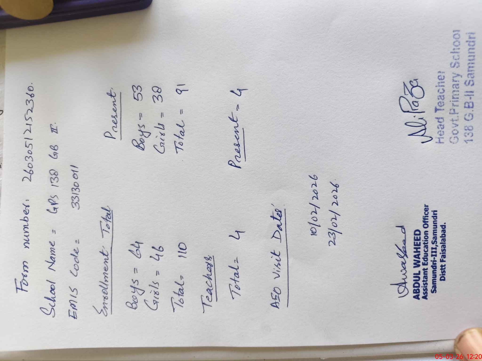 | EMIS Code: 33130011 | Name of School: GPS CHAK 138 GB II SAMUNDRI | |||