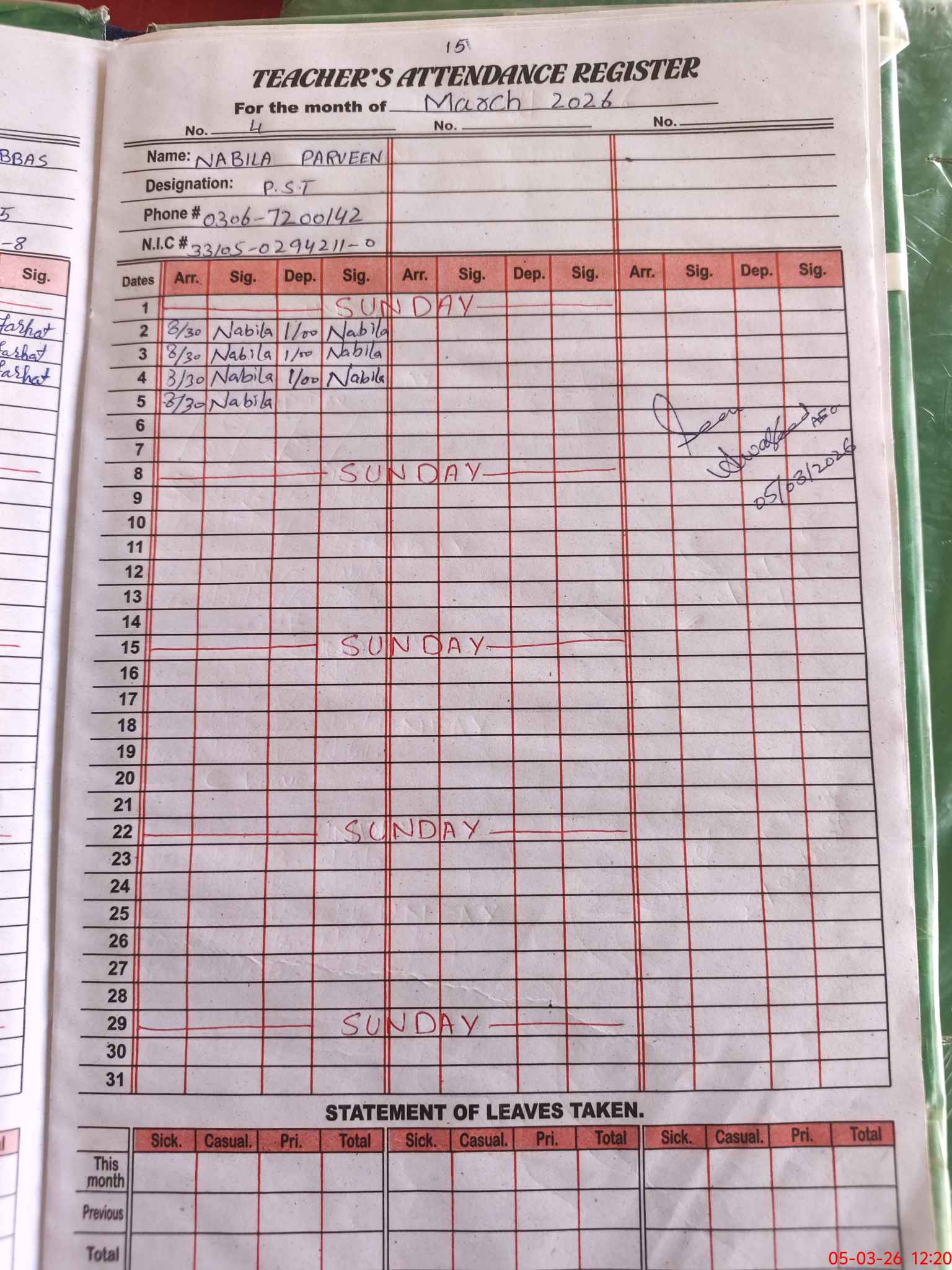 | Name: AL**** RA**** Designation: (School Headmaster's/Headmistress's) PST Phone/Cell Number: 03**** |