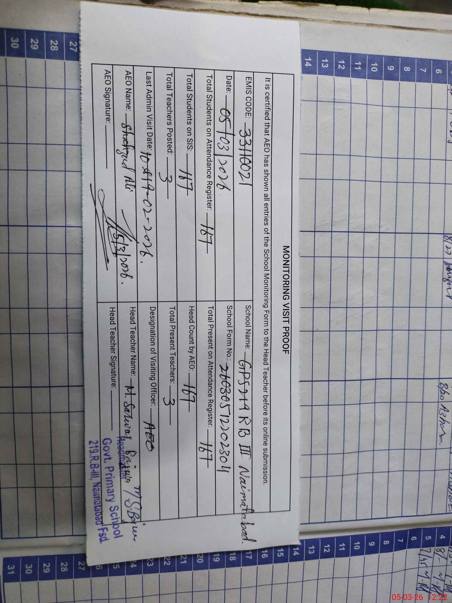 | EMIS Code: 33110021 | Name of School: GPS NAIMAT ABAD FSD | |||
