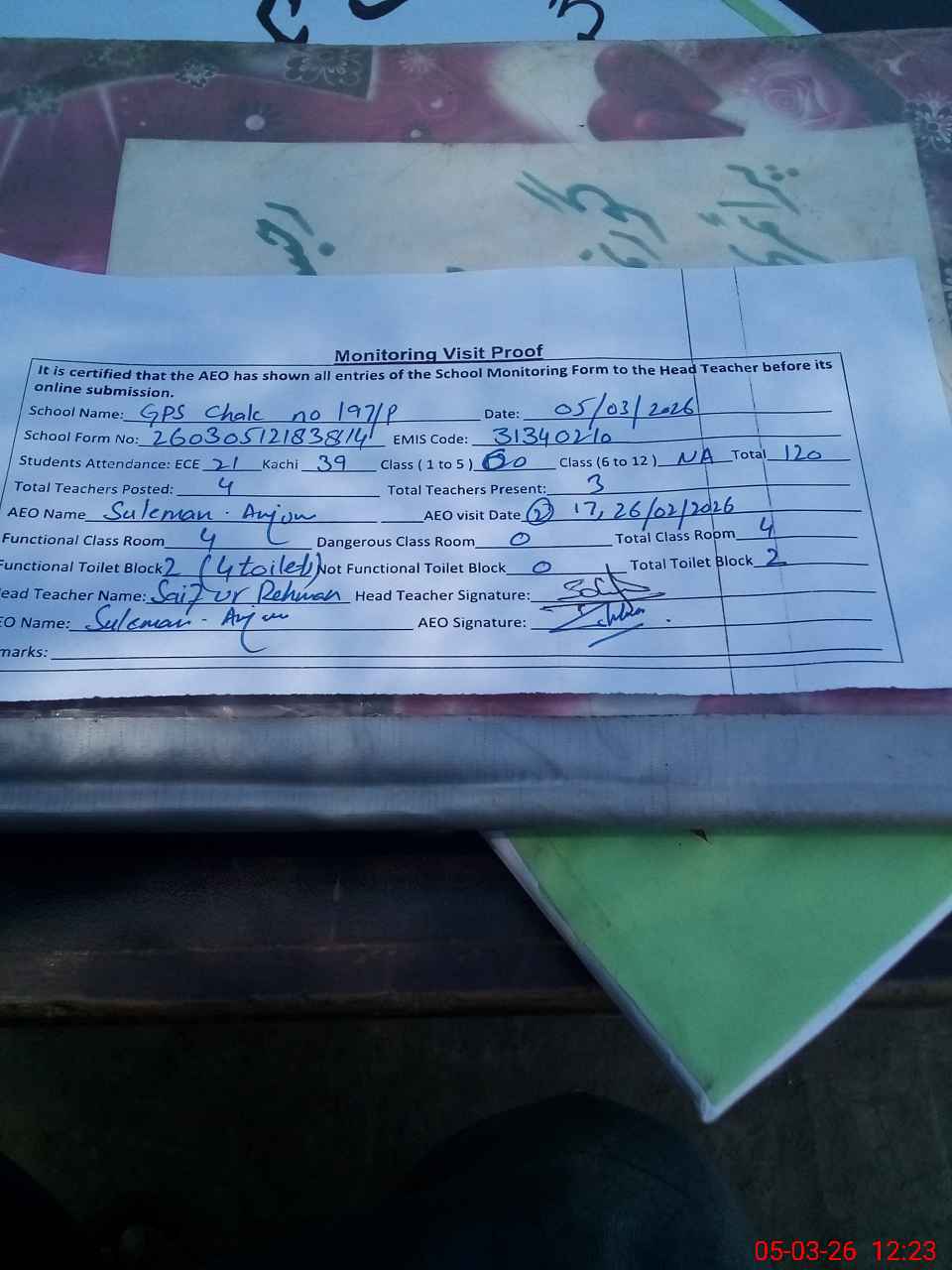 | Attendance Register | Head Teacher | MEA with School | Visit Proof |