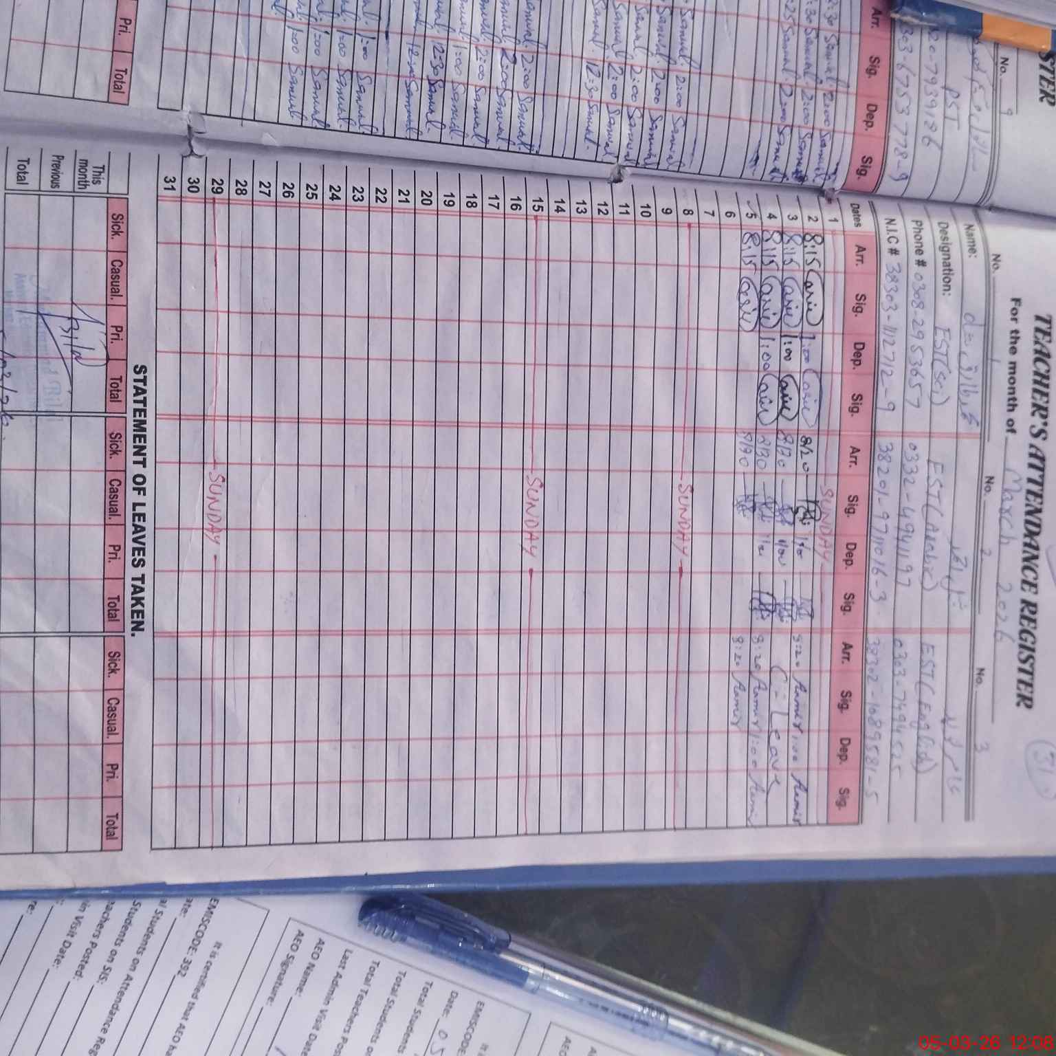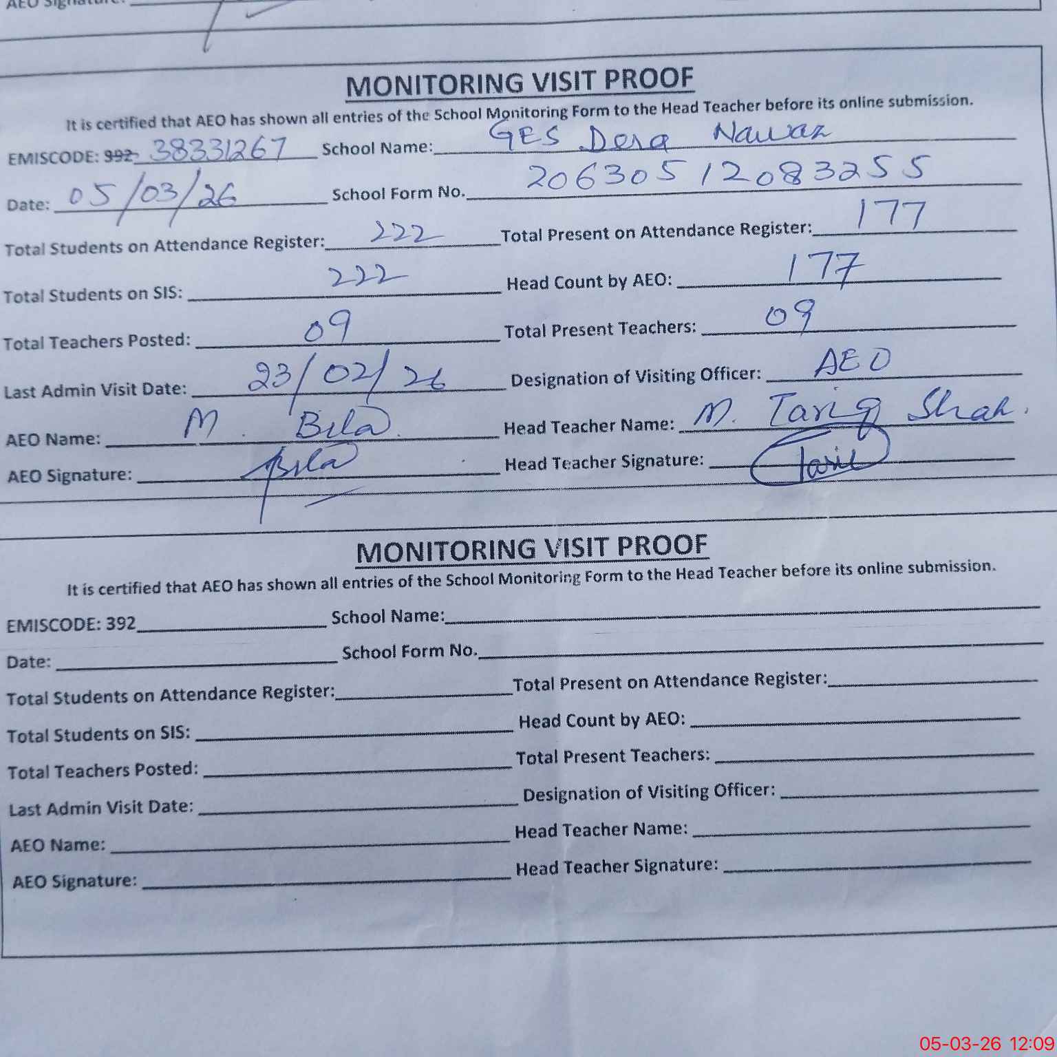 | Name: MTa**** Sh**** Designation: (School Headmaster's/Headmistress's) Est Sc Phone/Cell Number: 03**** |