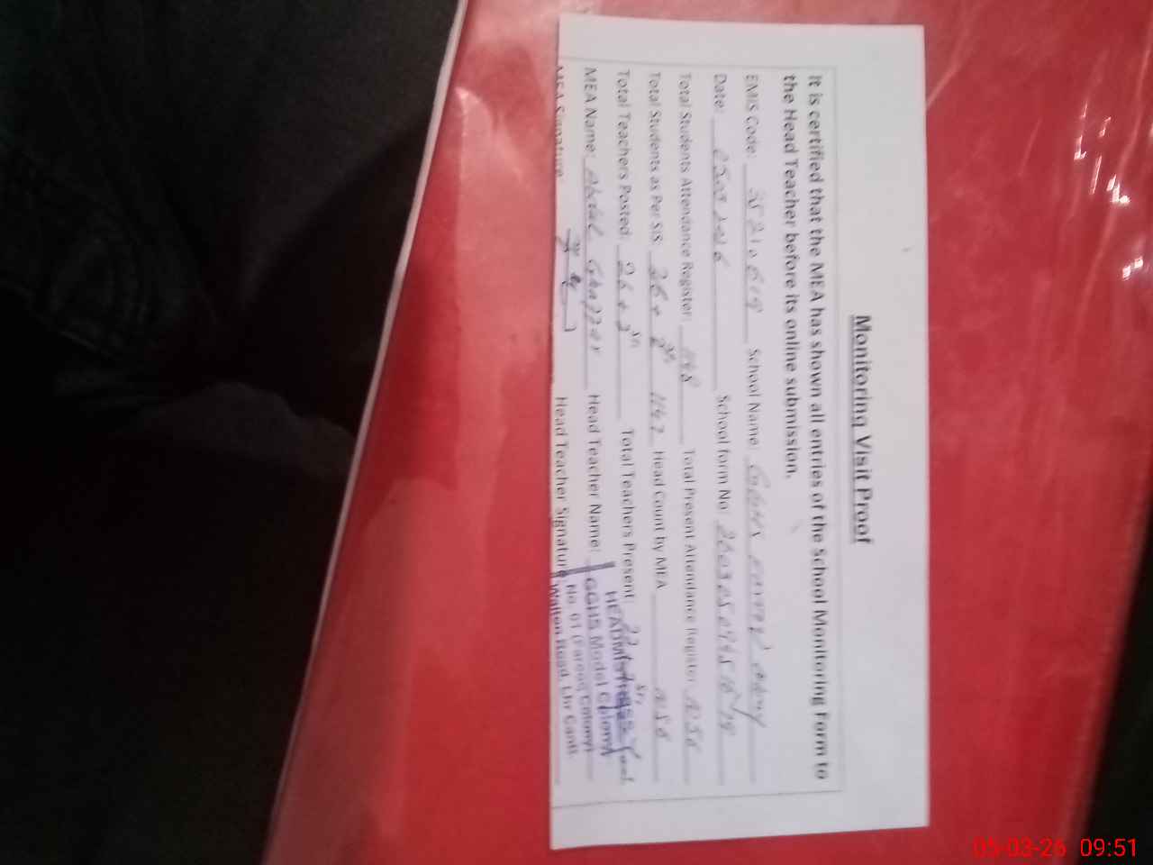 | Attendance Register | Head Teacher | MEA with School | Visit Proof |