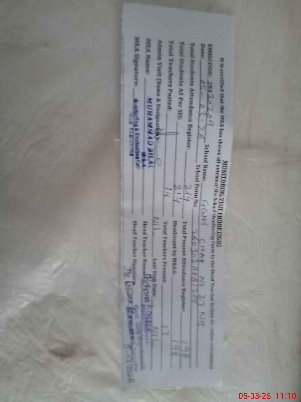 | Attendance Register | Head Teacher | MEA with School | Visit Proof |