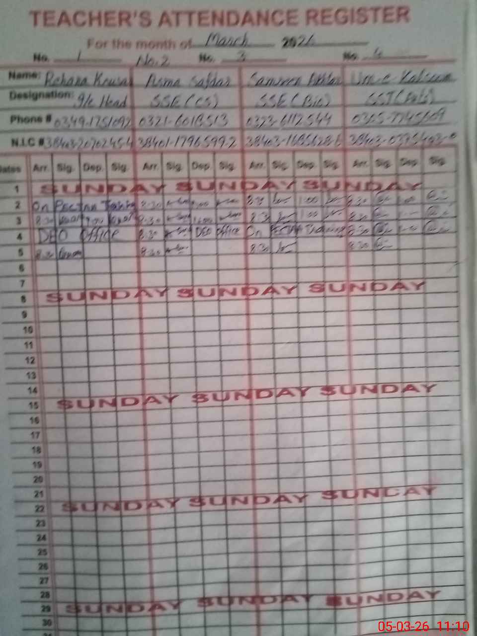 | CNIC | Full Name | Designation | R/C | Absence During Last Calender Month |