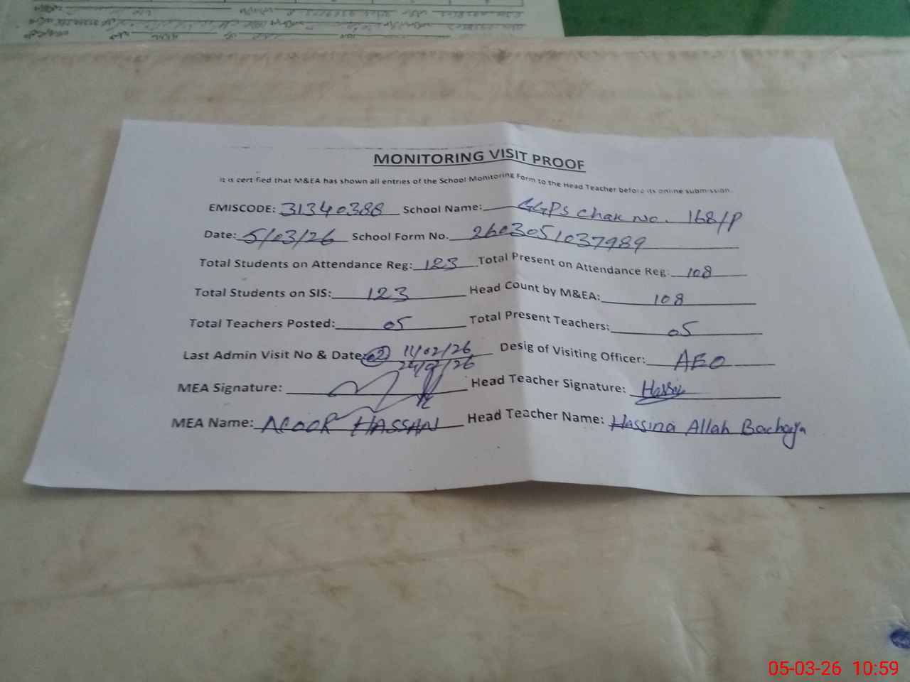 | Attendance Register | Head Teacher | MEA with School | Visit Proof |