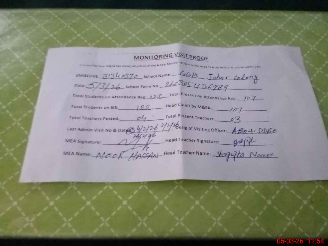 | EMIS Code: 31340370 | Name of School: GGPS JOHAR COLONY | |||