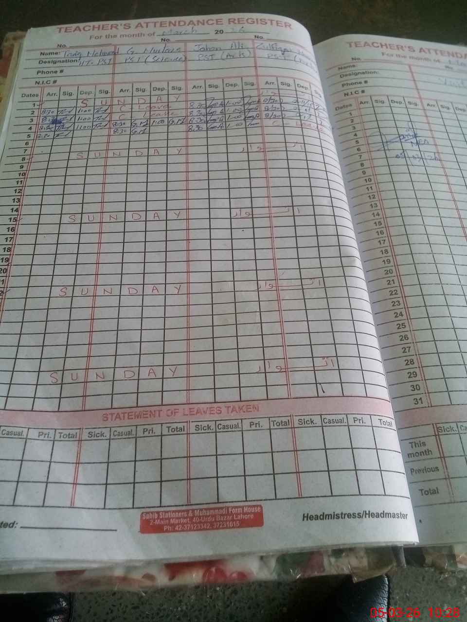 | CNIC | Full Name | Designation | R/C | Absence During Last Calender Month |