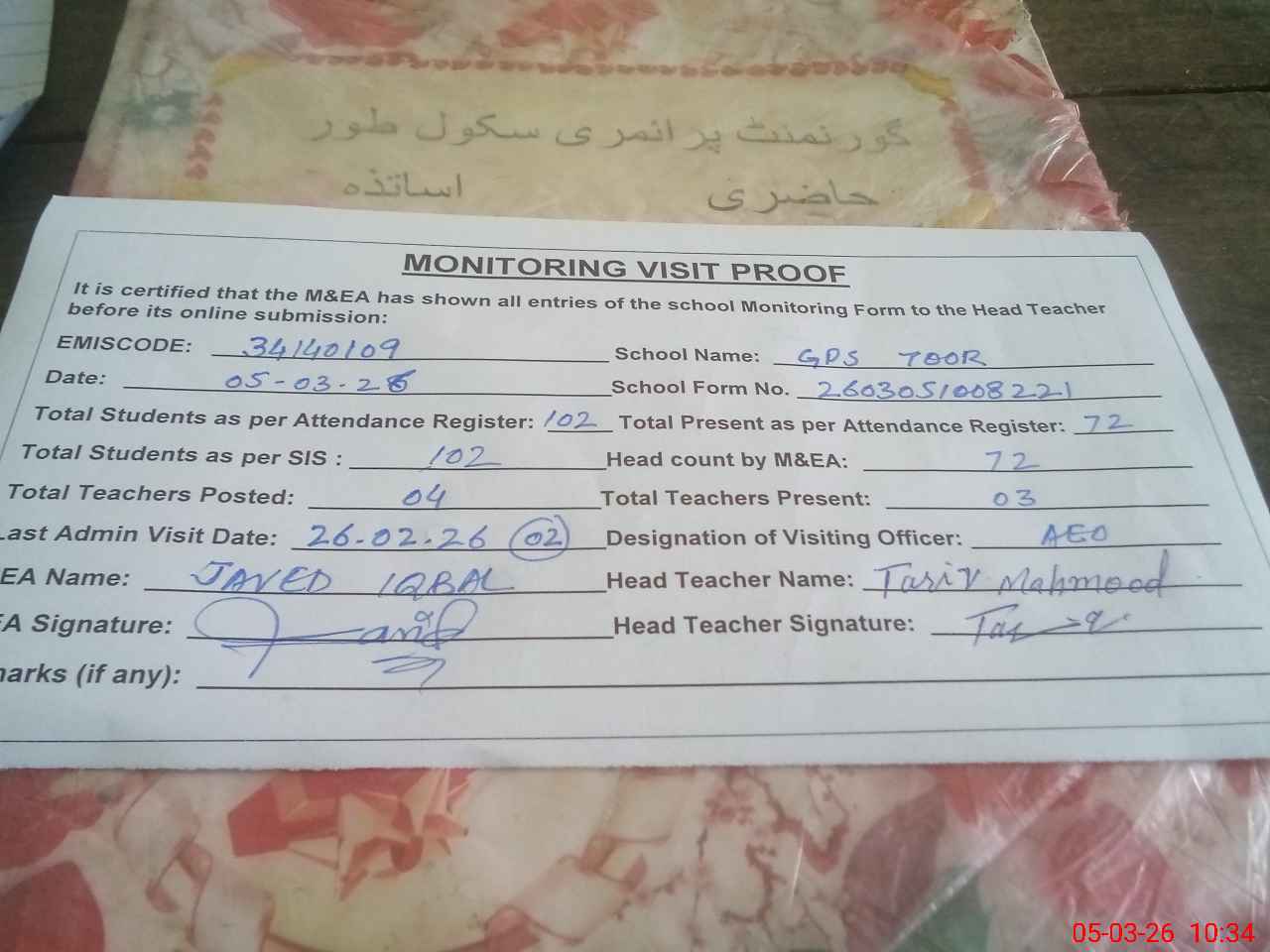 | Attendance Register | Head Teacher | MEA with School | Visit Proof |