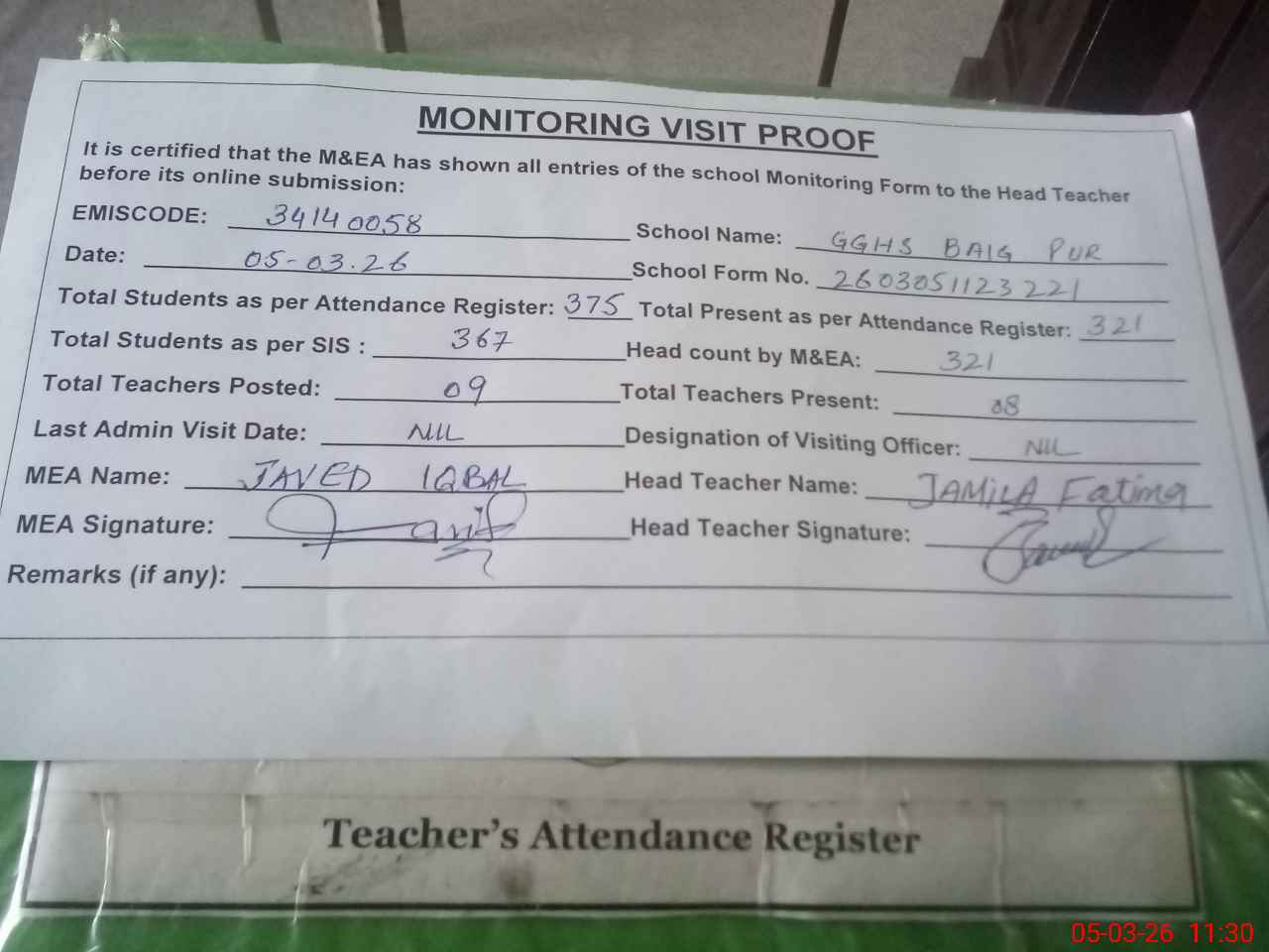 | Attendance Register | Head Teacher | MEA with School | Visit Proof |