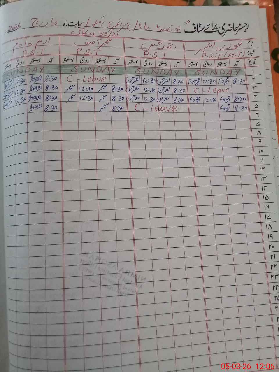 | CNIC | Full Name | Designation | R/C | Absence During Last Calender Month |