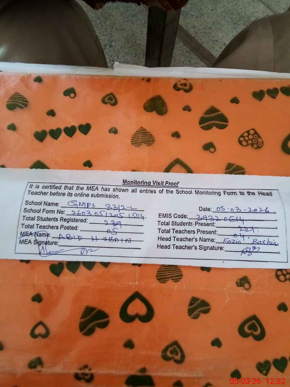 | Attendance Register | Head Teacher | MEA with School | Visit Proof |