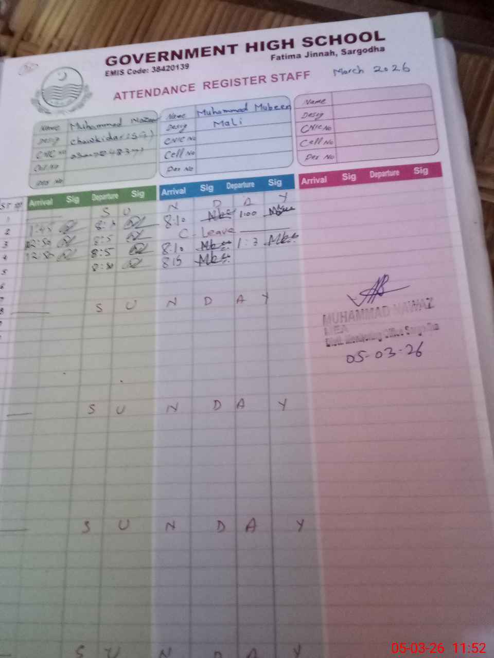 | CNIC | Full Name | Designation | R/C | Absence During Last Calender Month |