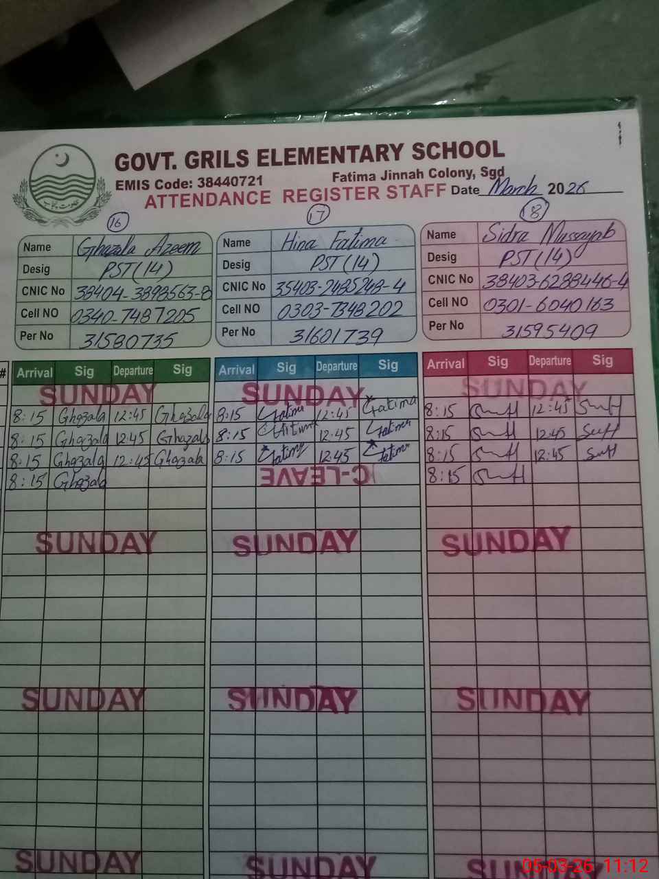 | CNIC | Full Name | Designation | R/C | Absence During Last Calender Month |