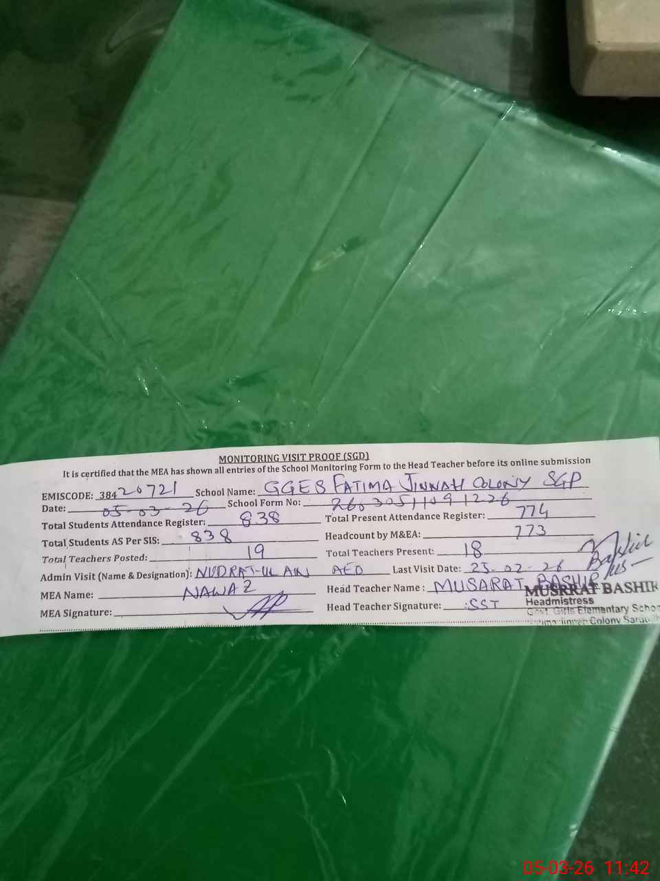 | Attendance Register | Head Teacher | MEA with School | Visit Proof |