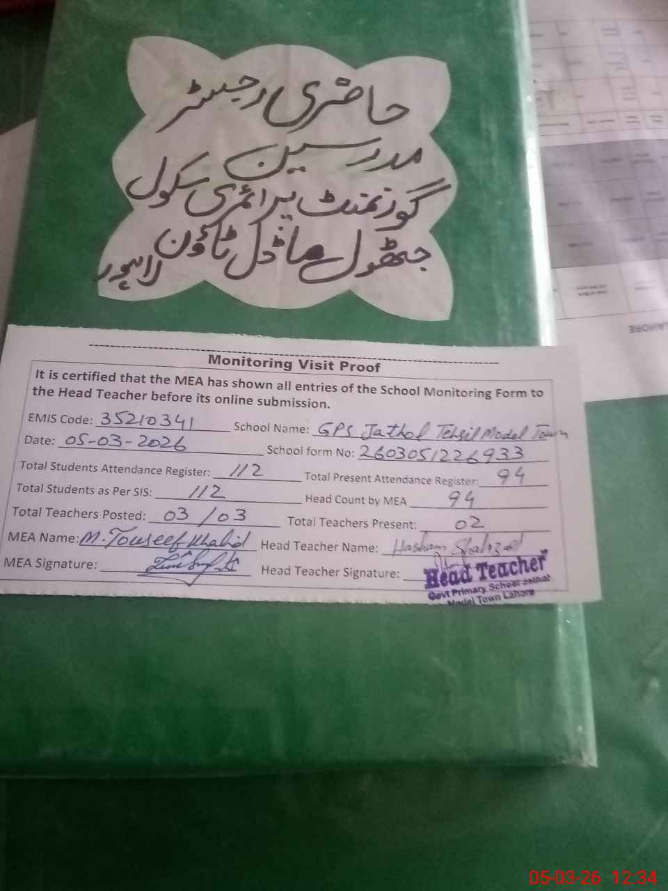 | Attendance Register | Head Teacher | MEA with School | Visit Proof |