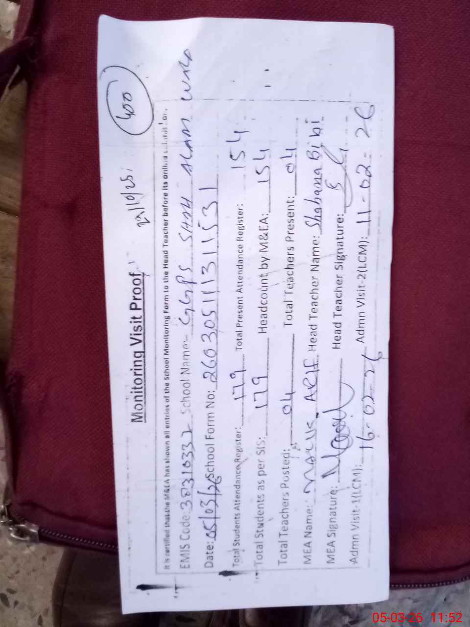 | Attendance Register | Head Teacher | MEA with School | Visit Proof |