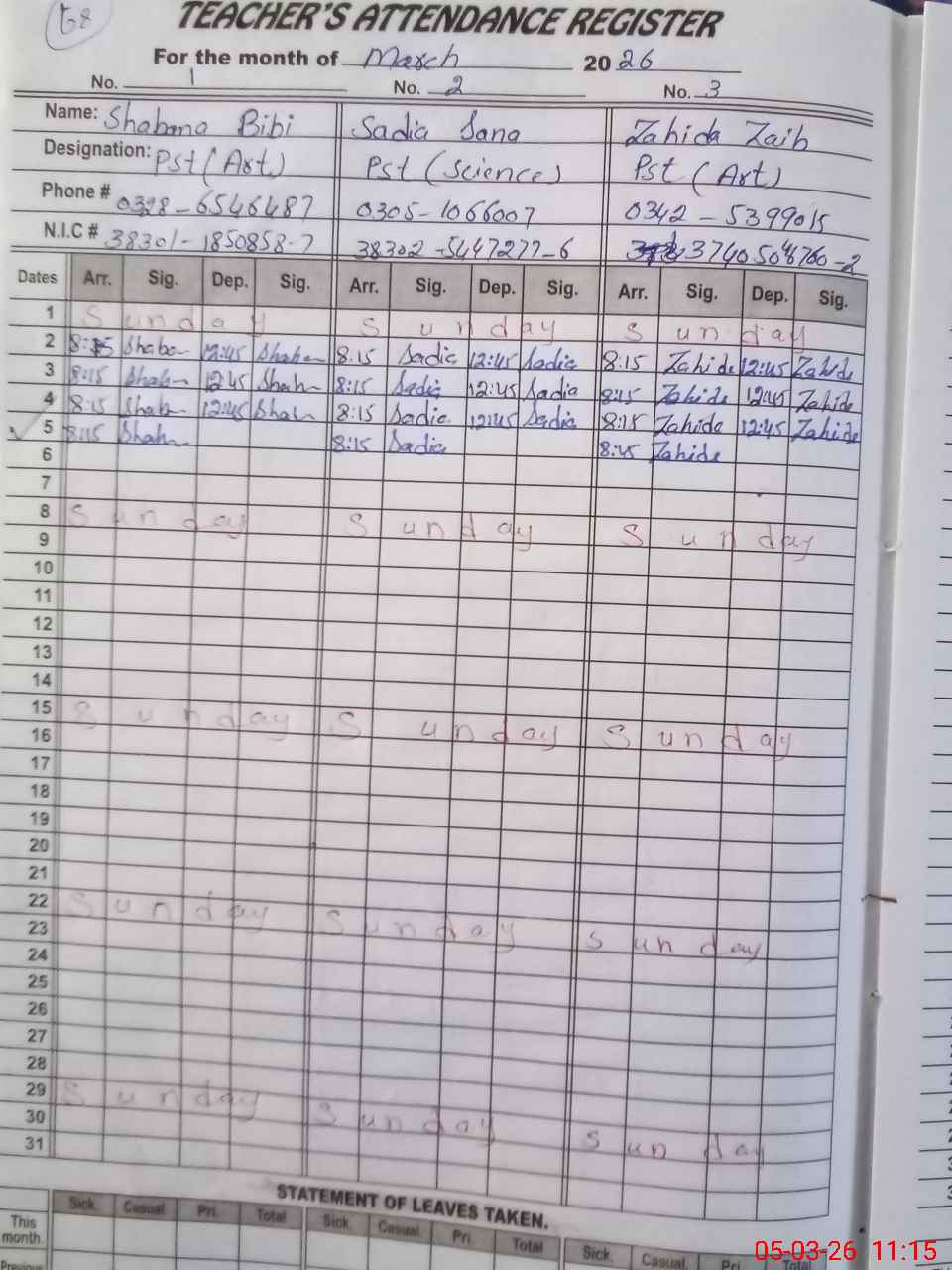 | CNIC | Full Name | Designation | R/C | Absence During Last Calender Month |
