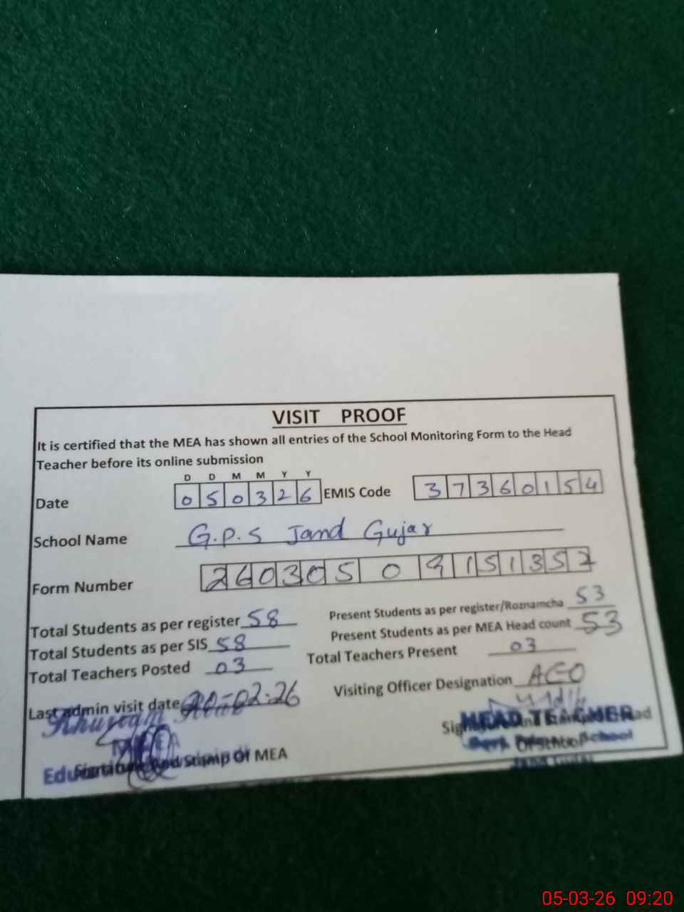 | Attendance Register | Head Teacher | MEA with School | Visit Proof |