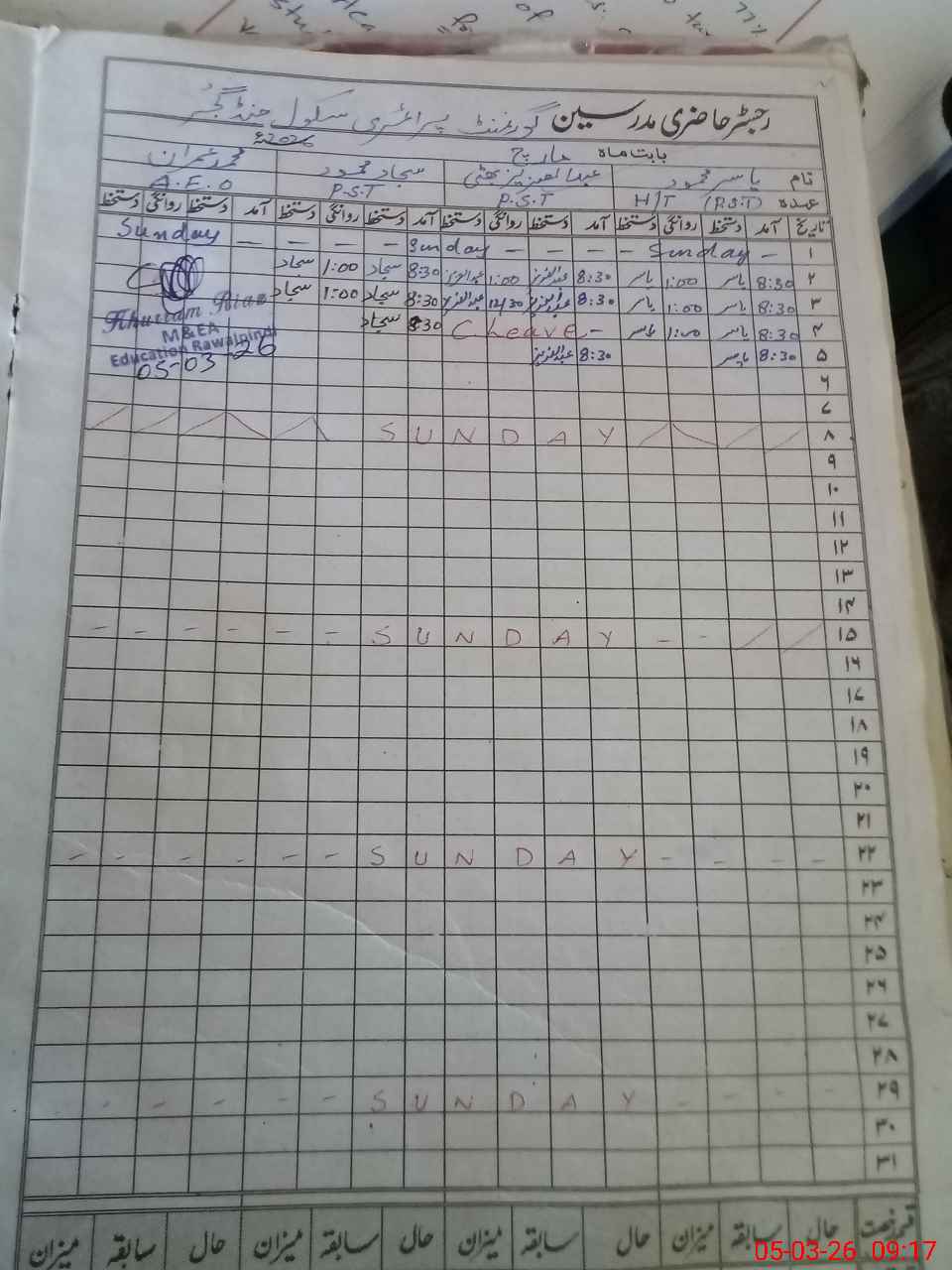 | CNIC | Full Name | Designation | R/C | Absence During Last Calender Month |
