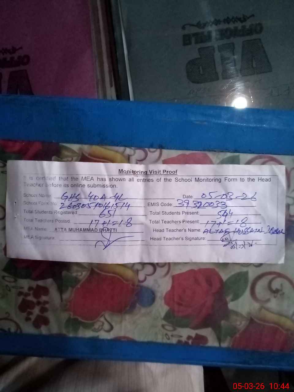 | Certified that this School was Inspected by the Undersigned MEA/DMO Today and the Information Stated Above is as Per Record. | |||||