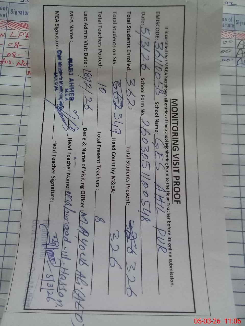 | Certified that this School was Inspected by the Undersigned MEA/DMO Today and the Information Stated Above is as Per Record. | |||||