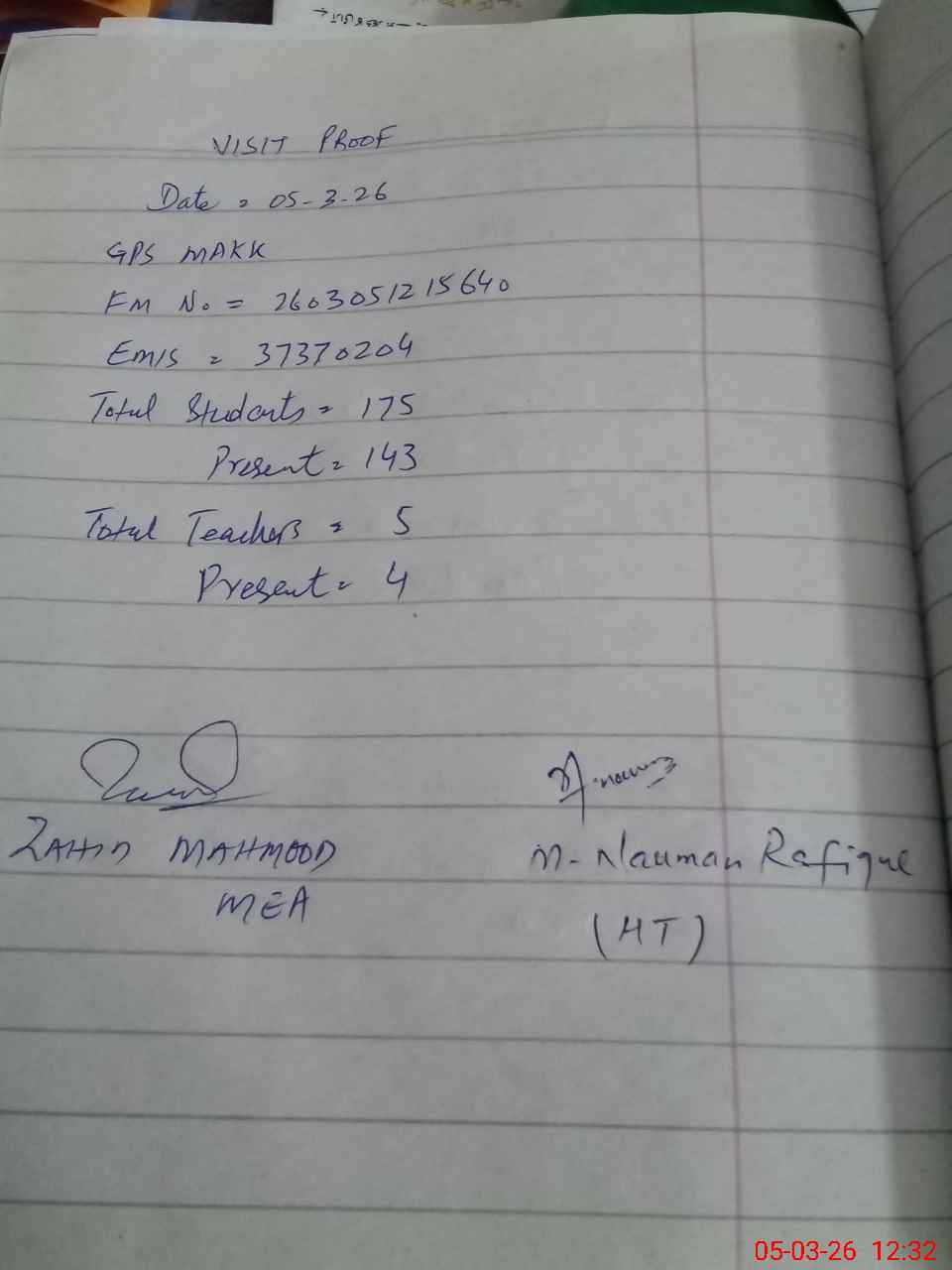 | Attendance Register | Head Teacher | MEA with School | Visit Proof |