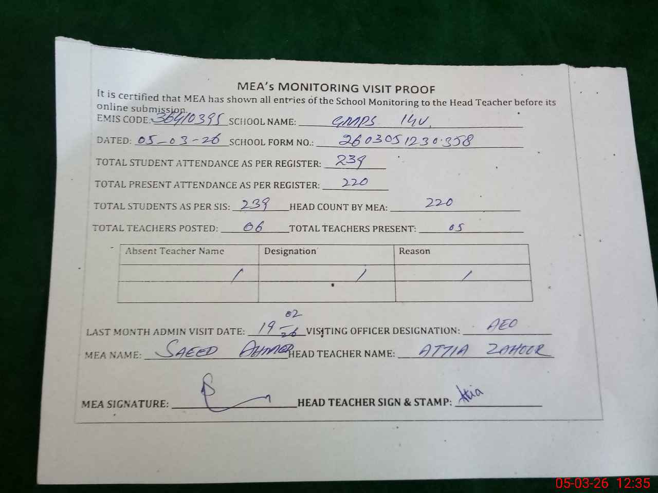 | EMIS Code: 36410395 | Name of School: GGPS 14/V, KABIRWALA | |||