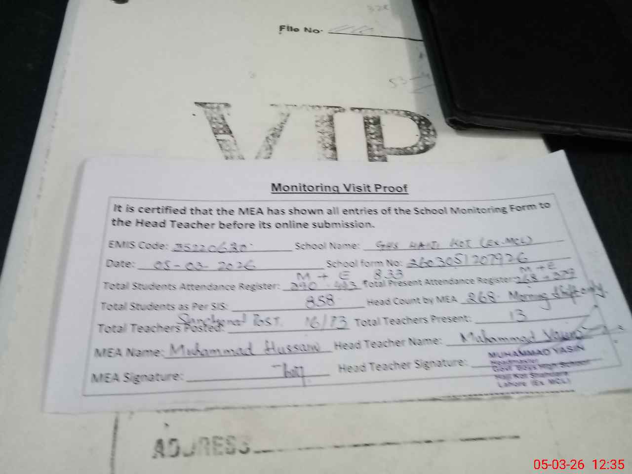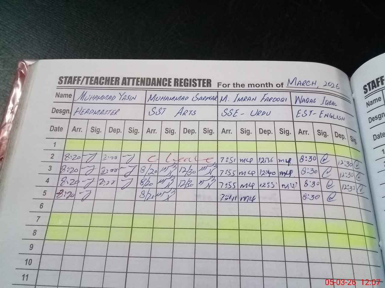 | Remarks (Use Separate Page if Required): 1 No administrator visit since long time 2 NSB data not up dated on sis 3 ECE and prep class students name for the month of march 2026 not written 4 No IT teacher in school | |||||