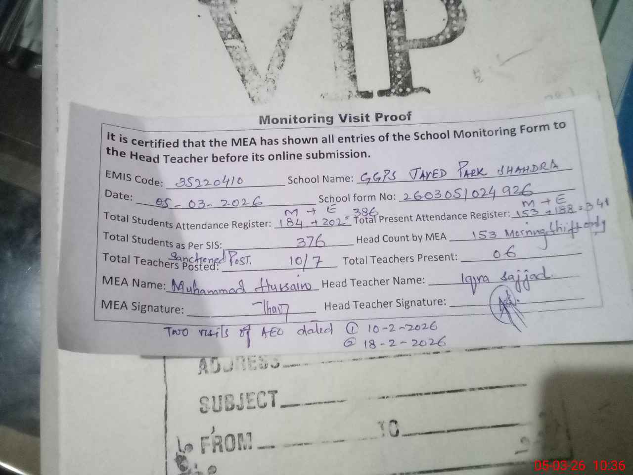 | Attendance Register | Head Teacher | MEA with School | Visit Proof |