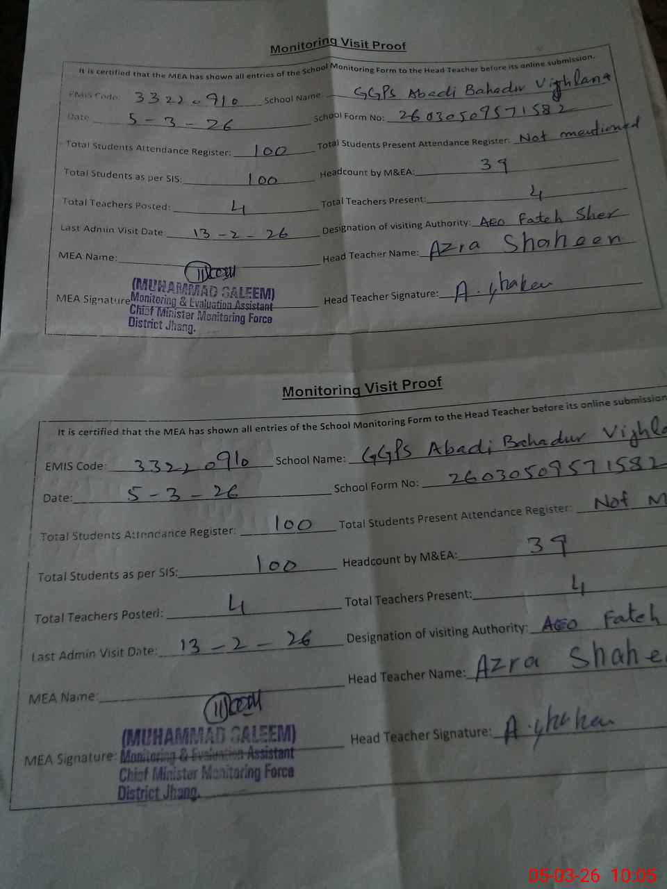 | Attendance Register | Head Teacher | MEA with School | Visit Proof |