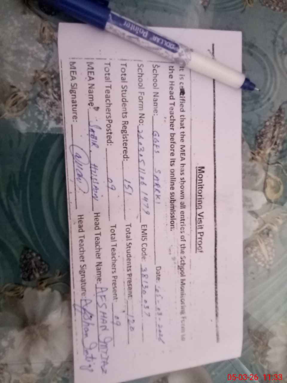 | Attendance Register | Head Teacher | MEA with School | Visit Proof |