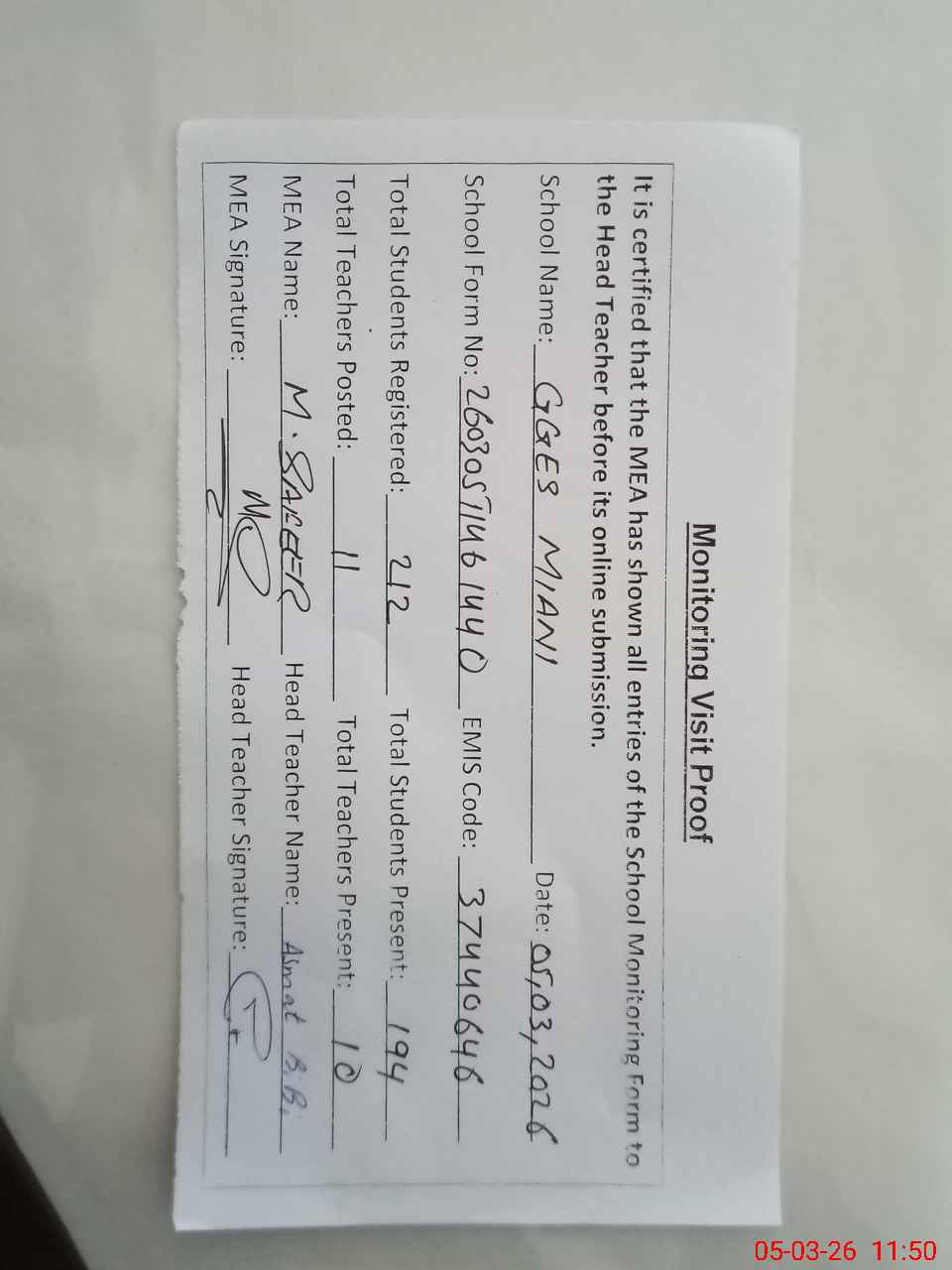 | Attendance Register | Head Teacher | MEA with School | Visit Proof |