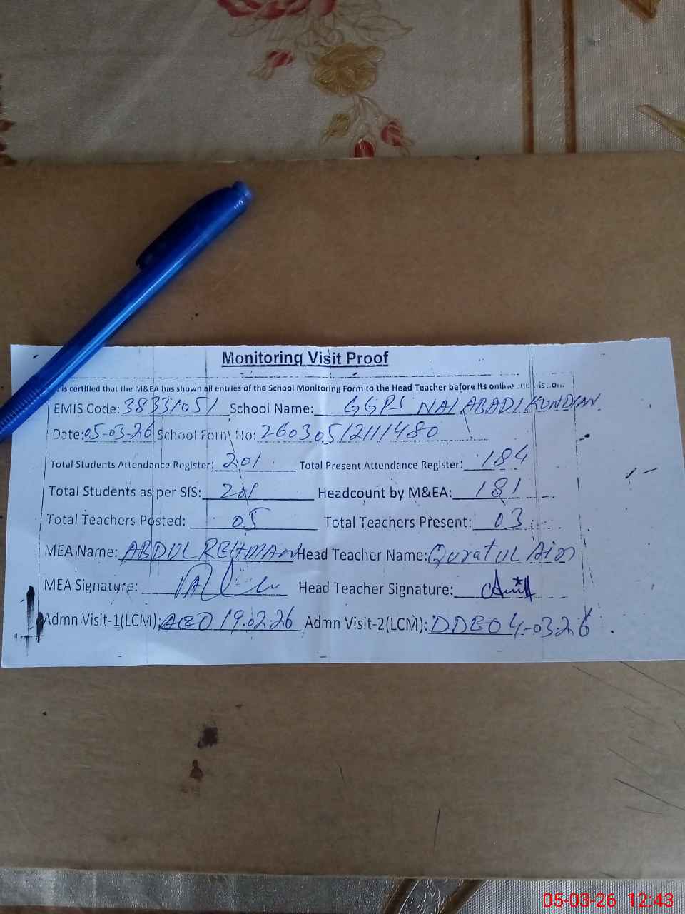 | Attendance Register | Head Teacher | MEA with School | Visit Proof |