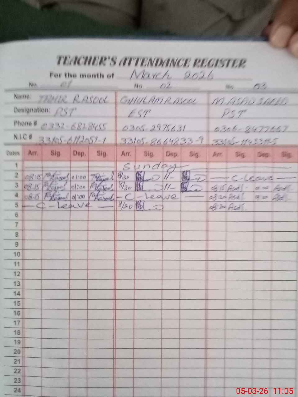 | CNIC | Full Name | Designation | R/C | Absence during last cal. month |