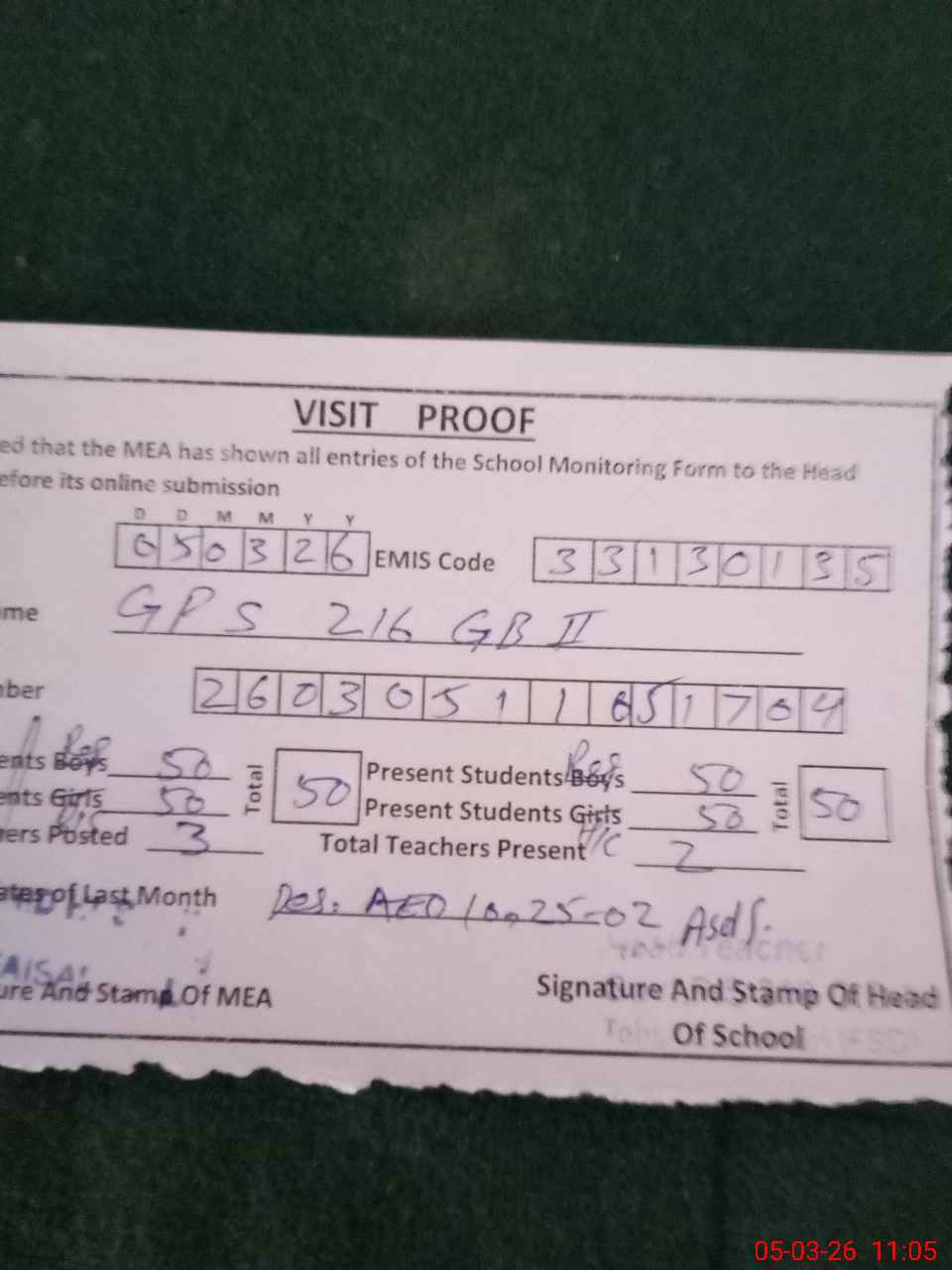 | EMIS Code: 33130135 | Name of School: GPS 216 GB II | |||