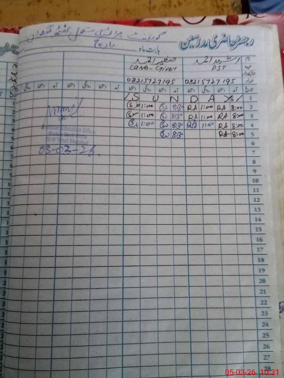| 61**** | Mu**** Am**** Kh**** | Temporary | 0 | 0 | 0 | 0 | 0 | 0 | 0 | 0 | 0 | Absent (Un-Authorized) | |