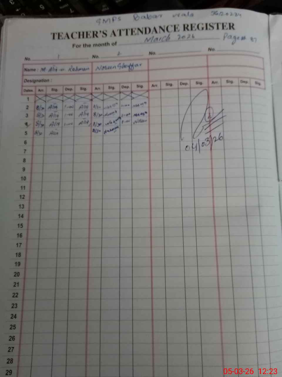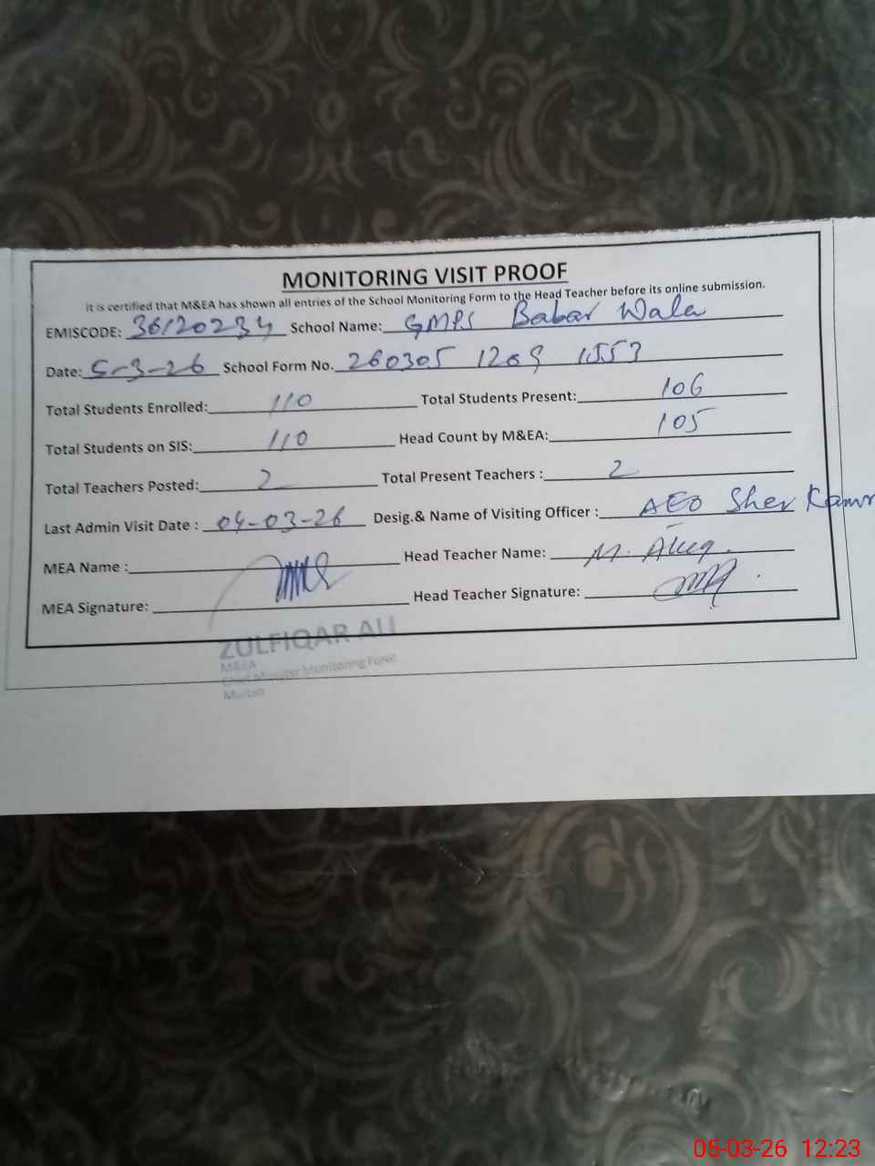 | EMIS Code: 36120234 | Name of School: GMPS BABAR WALA (KALO WALA) | |||