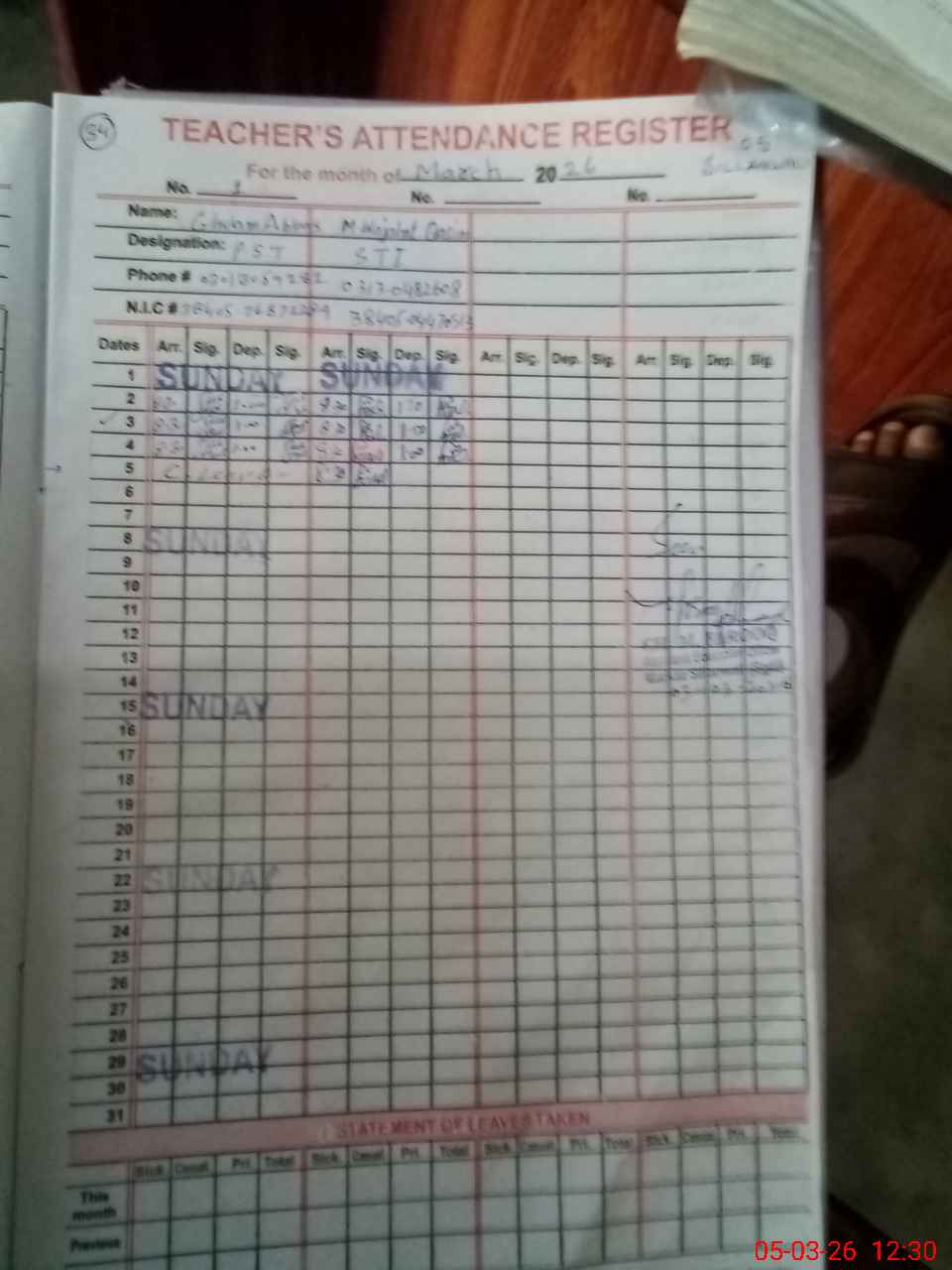 | Name: Gh**** Ab**** Designation: (School Headmaster's/Headmistress's) PST Phone/Cell Number: 03**** |