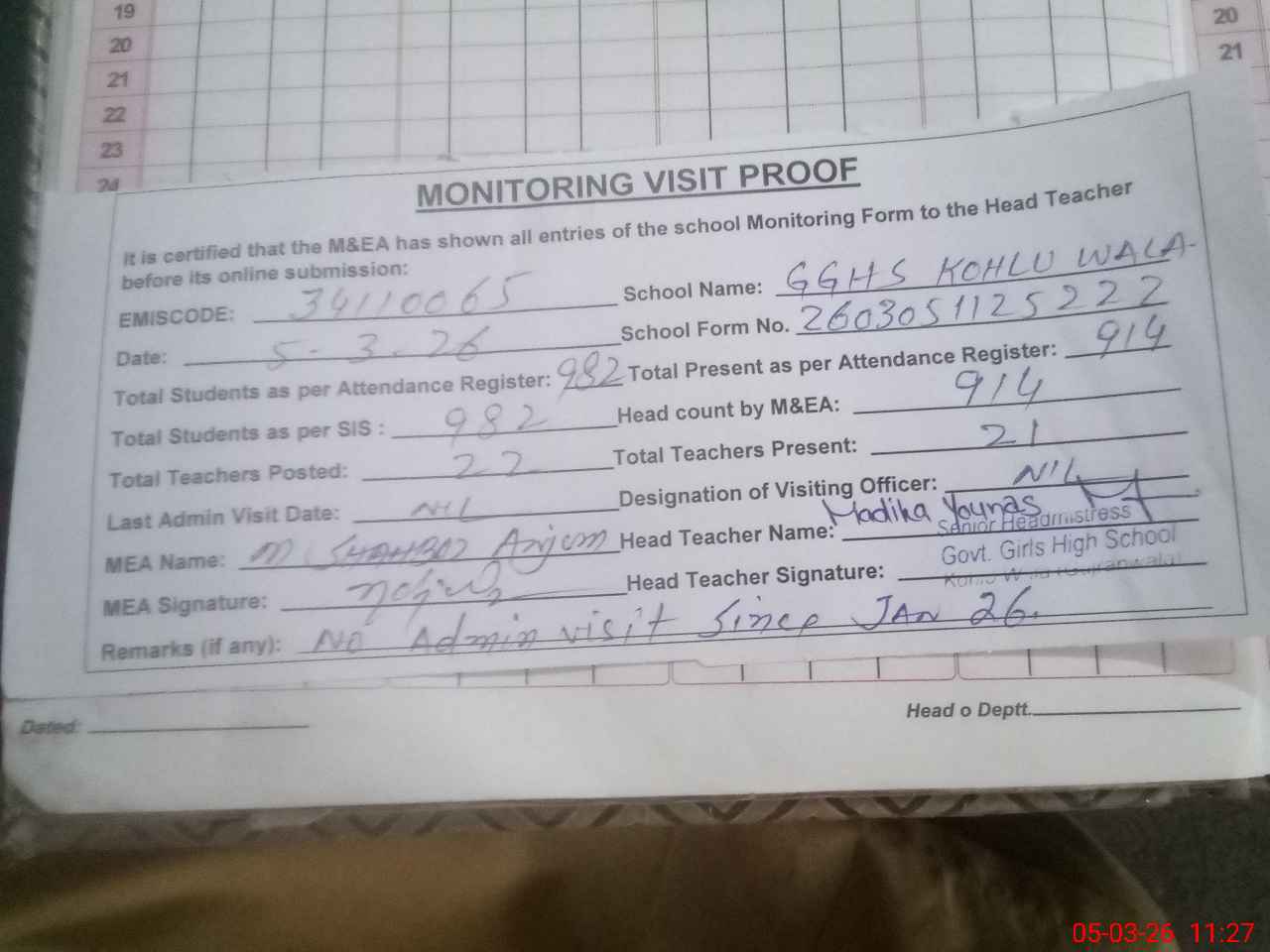 | Attendance Register | Head Teacher | MEA with School | Visit Proof |