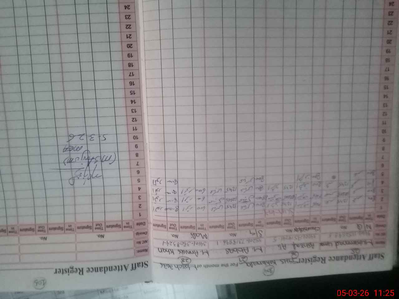 | CNIC | Full Name | Designation | R/C | Absence During Last Calender Month |