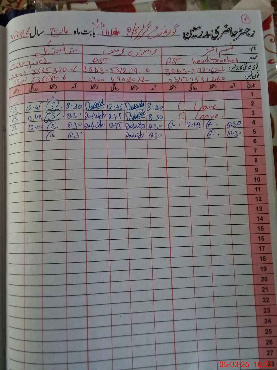 | CNIC | Full Name | Designation | R/C | Absence During Last Calender Month |