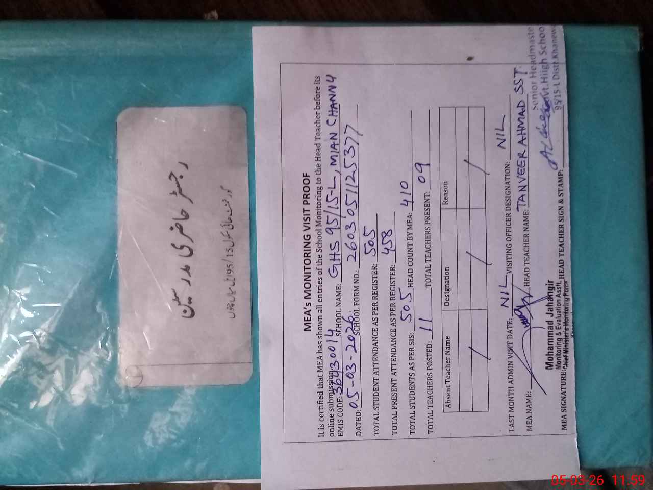 | Attendance Register | Head Teacher | MEA with School | Visit Proof |
