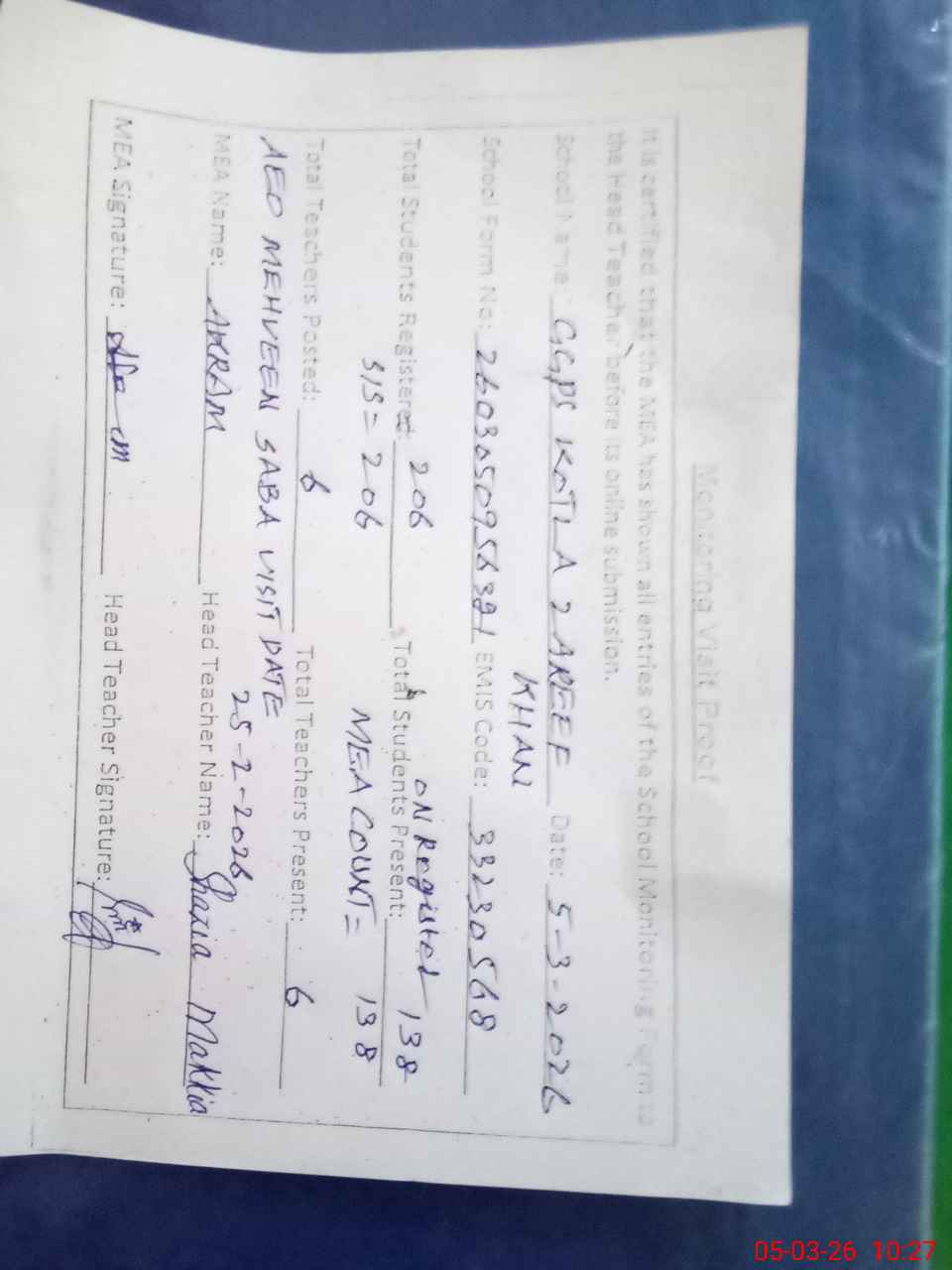 | Attendance Register | Head Teacher | MEA with School | Visit Proof |