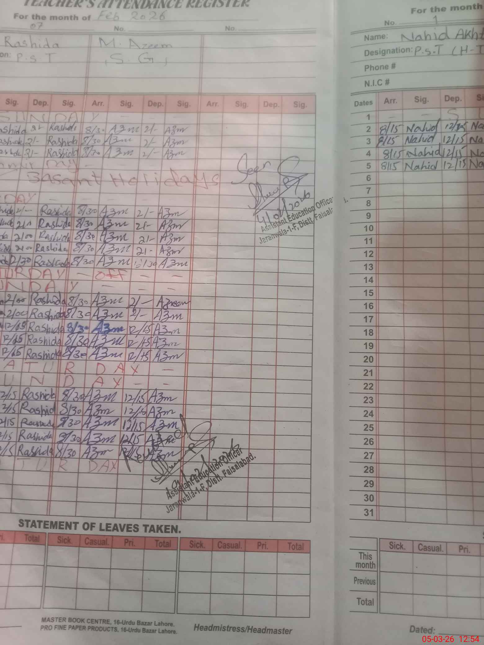 | Name: NA**** AK**** Designation: (School Headmaster's/Headmistress's) PST Phone/Cell Number: 03**** |