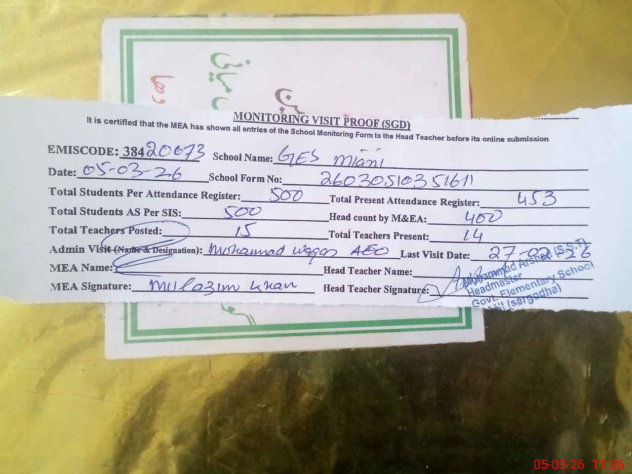 | Attendance Register | Head Teacher | MEA with School | Visit Proof |