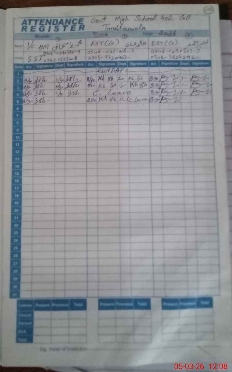 | Name: MU**** IS**** Designation: (School Headmaster's/Headmistress's) SST (ARTS) Phone/Cell Number: 03**** |