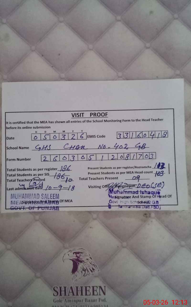 | EMIS Code: 33160418 | Name of School: GHS CHAK NO. 402/GB TANDLIANWALA | |||