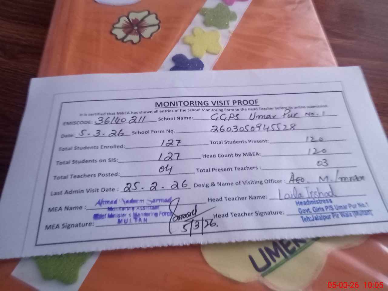 | EMIS Code: 36140211 | Name of School: GGPS UMER PUR 1 | |||
