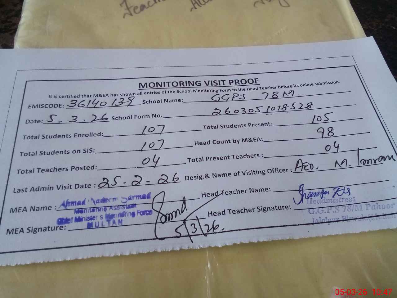 | Attendance Register | Head Teacher | MEA with School | Visit Proof |